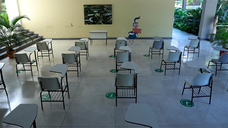 Inicialmente, as salas de aula ao livre foram instaladas no hall dos blocos D e K e no jardim próximo à pista de atletismo.