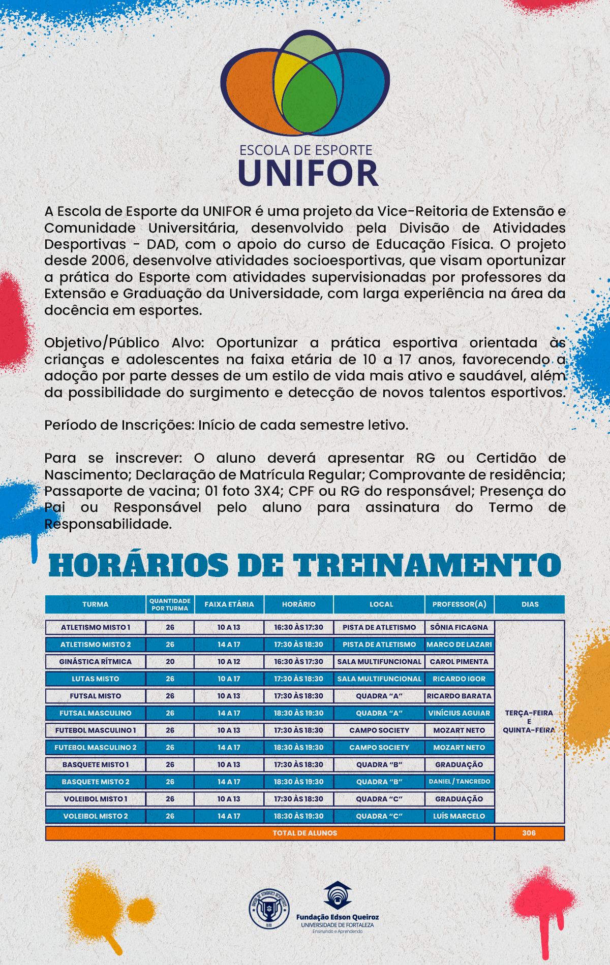 Já o Reitor da Unifor, Dr. Randal Pompeu, ressalta a importância do projeto de extensão, em funcionamento desde 2006, que envolve alunos e docentes dos cursos da área de saúde na formação de jovens atletas.