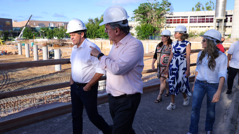 Na tarde desta quarta-feira (26), o prefeito de Fortaleza, Evandro Leitão, acompanhado da vice-prefeita Gabriela Aguiar, da secretária da Cultura, Helena Barbosa, da secretária executiva da Cultura, Ticiana Studart, da secretária de Turismo, Denise Carrá, do secretário da Regional 7, Francisco Ibiapina, e do secretário da Regional 6, Alexandre Medeiros, visitou as obras do Complexo Cultural Yolanda e Edson Queiroz. A comitiva foi recebida na Reitoria da Universidade de Fortaleza pela presidente da Fundação Edson Queiroz, Lenise Queiroz Rocha, e pelo Reitor da Unifor, Randal Martins Pompeu, que apresentaram o projeto do novo equipamento cultural e o andamento das obras.