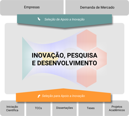 Camada superior: reúne ideias de entidades externas, como empresas e demandas de mercado. A Unifor atua com sua expertise acadêmica para resolver problemas práticos — muitas vezes identificando esses problemas antes mesmo das próprias empresas.