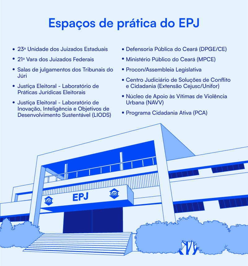 O Escritório de Prática Jurídica (EPJ) da Universidade de Fortaleza presta atendimento gratuito à comunidade por meio do encaminhamento de processos e orientações de natureza legal. Ele é campo de estágio para os alunos da instituição, em especial dos cursos de Direito e Psicologia, que operam sob a supervisão de professores e com uma equipe de analistas jurídicos, psicóloga e assistente social.