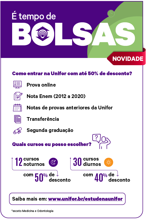 Para o segundo semestre de 2021, a Universidade de Fortaleza está oferecendo uma nova política de descontos*: os novos alunos serão agraciados com até 50% de abatimento na mensalidade para cursos noturnos e 40% para cursos diurnos (exceto Medicina e Odontologia). Os descontos não são cumulativos e valem apenas para 2021.2.