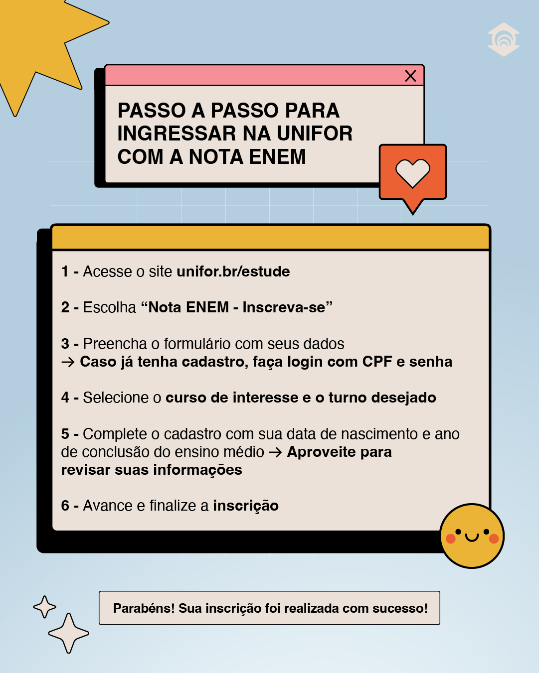 Concluído o cadastro, a Unifor, em parceria com o Instituto Nacional de Estudos e Pesquisas Educacionais Anísio Teixeira (Inep), realiza a verificação da nota do Enem. Os candidatos com pontuação compatível com o curso escolhido passam por análise, realizada em até 24 horas úteis, e, quando aprovados, ficam liberados para efetuar a matrícula.