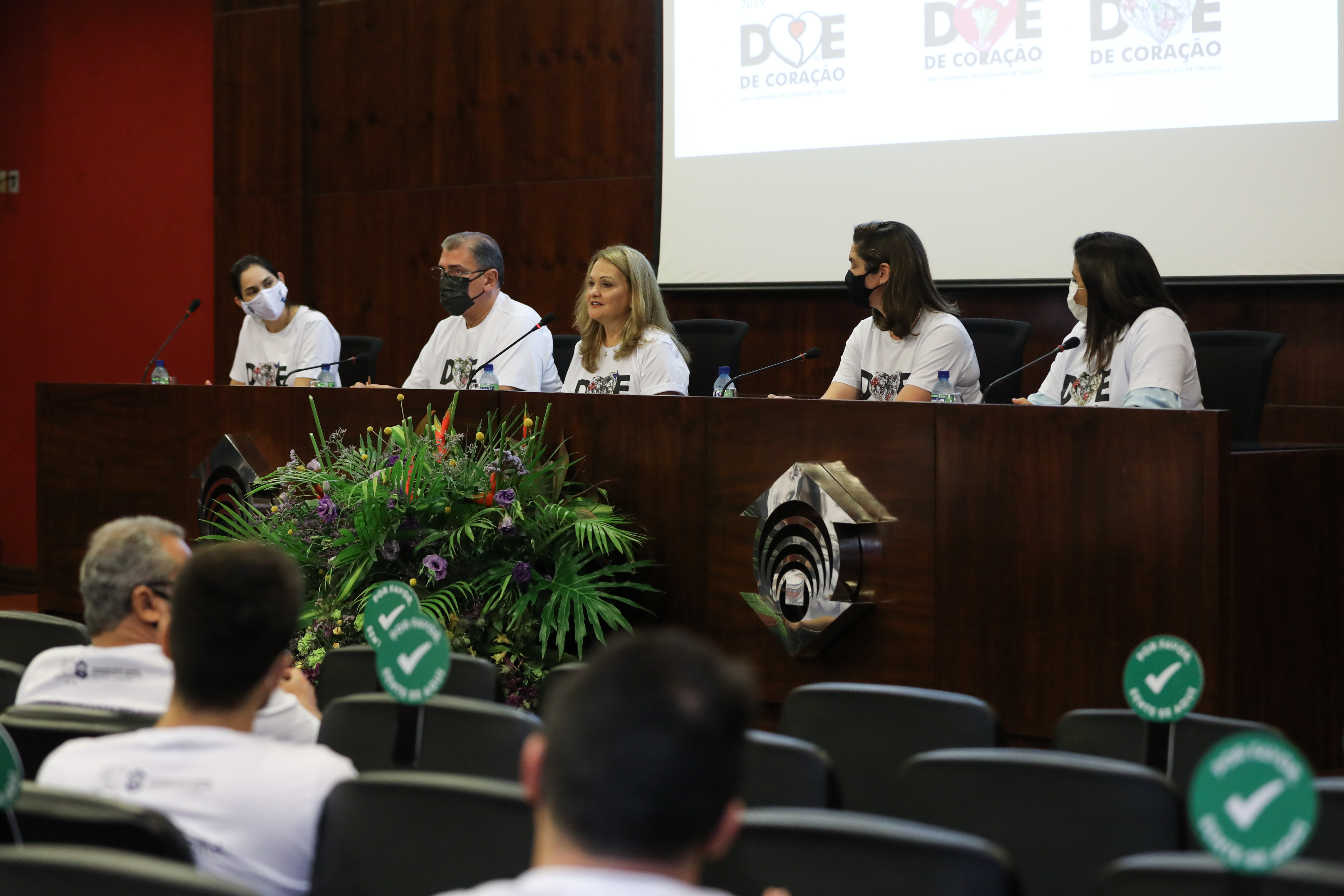 A mesa de abertura contou com a participação da presidente da Fundação Edson Queiroz, Lenise Queiroz Rocha; o reitor em exercício da Universidade de Fortaleza, Randal Martins Pompeu; a diretora do Centro de Ciências da Saúde da Unifor, Lia Brasil; a coordenadora da Doe de Coração 2021, Janaína Ramalho, e a secretaria executiva de Vigilância e Regulação da Saúde do Ceará, Ricristhi Gonçalves.