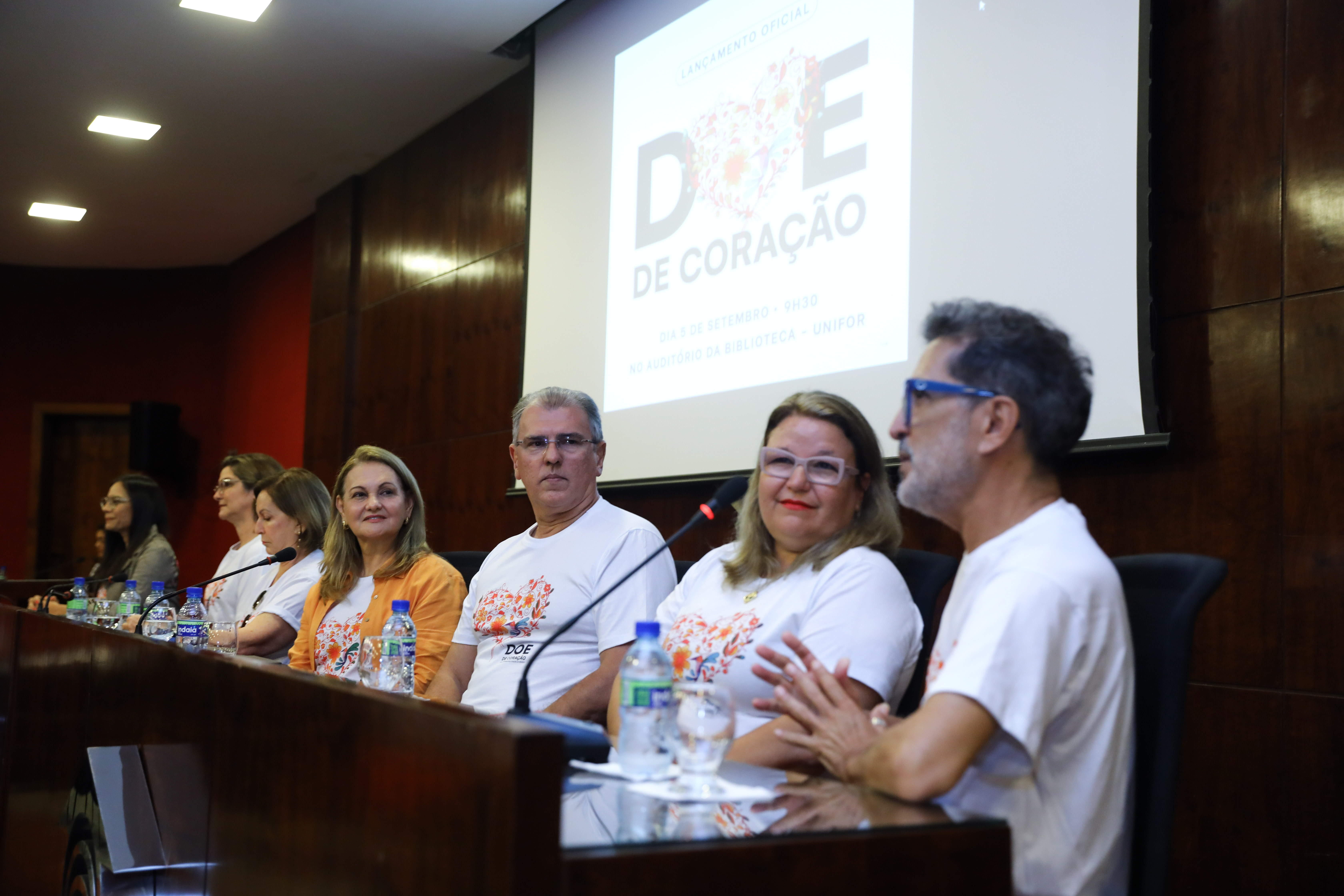 A mesa de abertura foi formada pela Presidente da Fundação, Lenise Queiroz Rocha, a Reitora da Unifor, professora Fátima Veras, o Vice-Reitor de Extensão e Comunidade Universitária, professor Randal Pompeu, a diretora do Centro de Ciências da Saúde da instituição, professora Lia Brasil, a coordenadora da Doe de Coração 2022, professora Elodie Hyppolito, e o artista plástico que assina a nova marca da campanha, Mario Sanders.