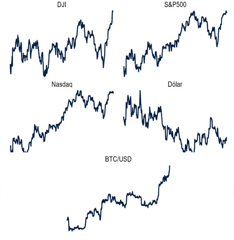 Nos mercados globais, outubro foi de forte desempenho positivo para as bolsas, impulsionado sobretudo pela mudança de sentimento do Fed, que se mostrou mais dovish. O Nasdaq (+4,7%) e o S&P 500 (+2,3%) registraram ganhos robustos, enquanto o índice japonês Nikkei 225 (+14,2%) teve um crescimento expressivo e o alemão DAX (+1,0%) também avançou. O índice de volatilidade VIX (+3,9%) subiu, refletindo ainda as incertezas em meio à alta dos mercados.