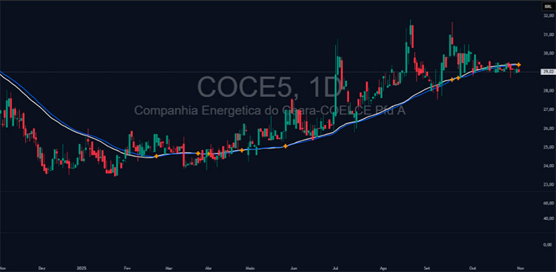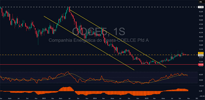 Posição: 31.10.2025Após um longo período de queda iniciado em meados de 2022, o ativo COCE5 encontrou um suporte relevante na região dos R$ 23,40 (linha vermelha), onde o fluxo vendedor perdeu intensidade. Esse ponto marcou o fim de um canal de baixa bem definido, evidenciado pelas linhas amarelas descendentes, que dominaram o comportamento do preço até o início de 2025.