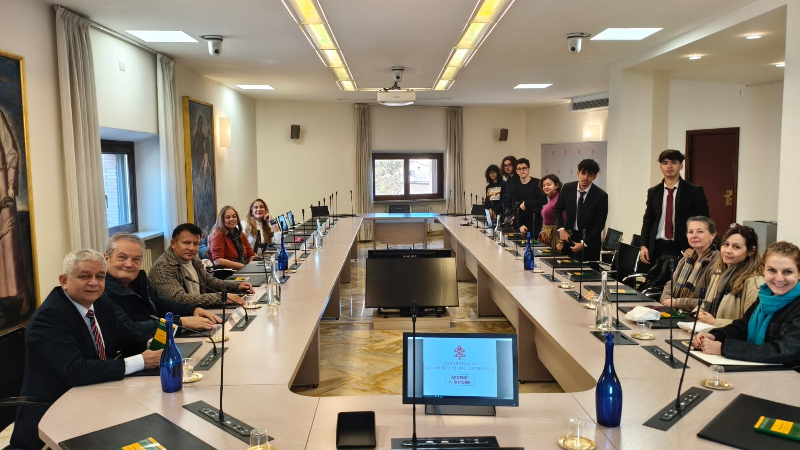 Neste primeiro momento da viagem, os discentes, acompanhados do professor Humberto Cunha, tiveram a oportunidade de visitar o Dicastério de Educação e Cultura do Vaticano. Na ocasião, o cardeal José Tolentino de Mendonça explicou aos visitantes as dinâmicas de trabalho da instituição.