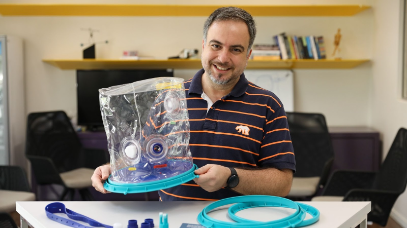 “A ideia original surgiu das interações da equipe. Sabíamos que, nos primeiros dias da pandemia na China, havia um alto índice de contaminação e letalidade entre os profissionais de saúde. Os métodos tradicionais de oxigenação usando máscaras, além de serem pouco eficientes para quadros graves, permitiam que o vírus se espalhasse pelo ambiente. Então, imaginamos que a ‘máscara ideal’ seria aquela que impedisse que o ar exalado pelo paciente se misturasse com o ar do ambiente”, explica Herbert.
