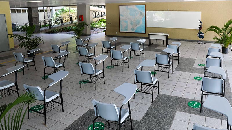 Inicialmente, as salas de aula ao livre foram instaladas no hall dos blocos D e K e no jardim próximo à pista de atletismo.