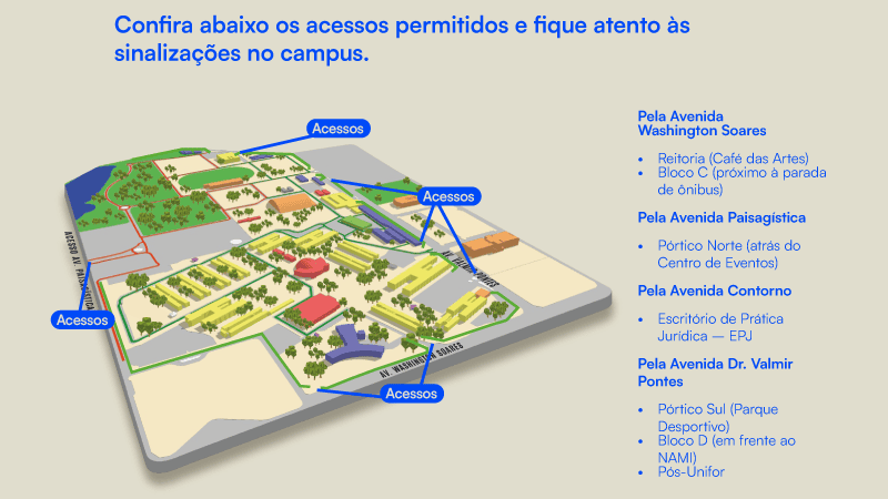 - O acesso dos alunos que circularem pela passarela da Washington Soares deverá ser feito pelo portão da Reitoria.
