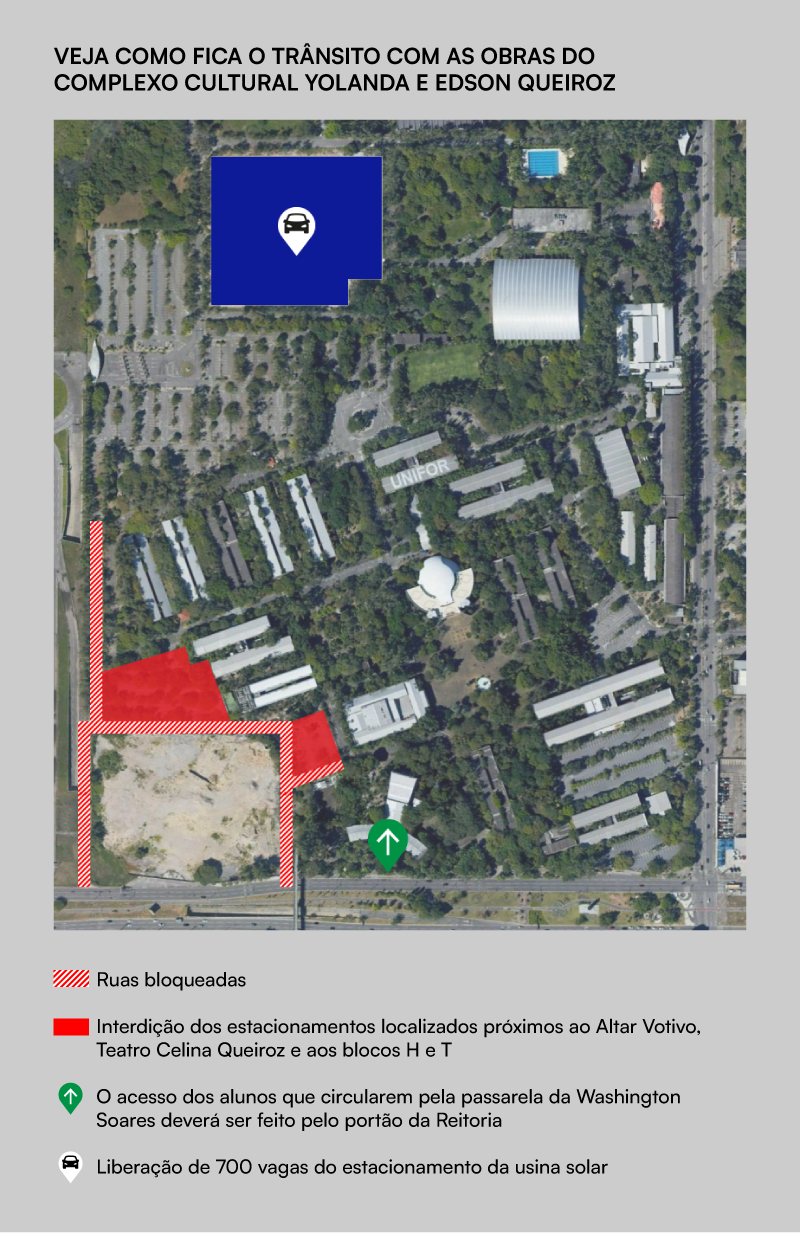 Em razão do início das obras, algumas vias de circulação de veículos e pedestres do Campus da Unifor serão provisoriamente interditadas ou alteradas. Confira a seguir as principais mudanças: