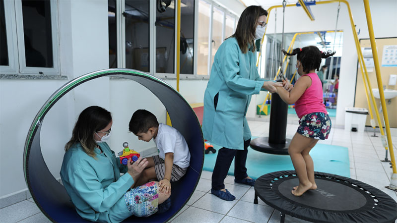 Atendimento interdisciplinar de Fisioterapia, Terapia Ocupacional e Fonoaudiologia para crianças de 2 a 10 anos de idade, duas vezes por semana.