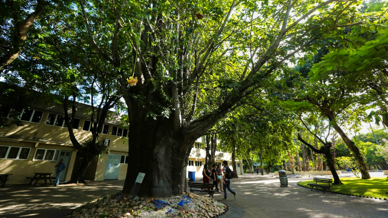 Poder apreciar do canto dos pássaros a árvores emblemáticas que formam verdadeiras esculturas vegetais, como os jucazeiros e pau-ferro de caules pomposos, o pau-brasil plantado na Praça Central pelo fundador Edson Queiroz ou mesmo os vultosos baobás, que chegaram ao campus nos anos 1970 pelas mãos de alunos do curso de Administração. “Temos aqui um laboratório, um verdadeiro jardim botânico”, resume, orgulhoso, o engenheiro agrônomo e consultor dos jardins da Unifor, Itamar Frota.