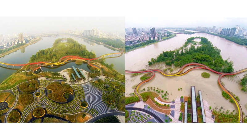 Na imagem, o Parque Jinhua Yanweizhou, na China, demonstra o conceito de cidade-esponja em períodos mais secos (à esquerda) e com mais fluxo hídrico (à direita), sincronizando as necessidades da natureza com o ambiente urbano (Fotos: Turenscape)
