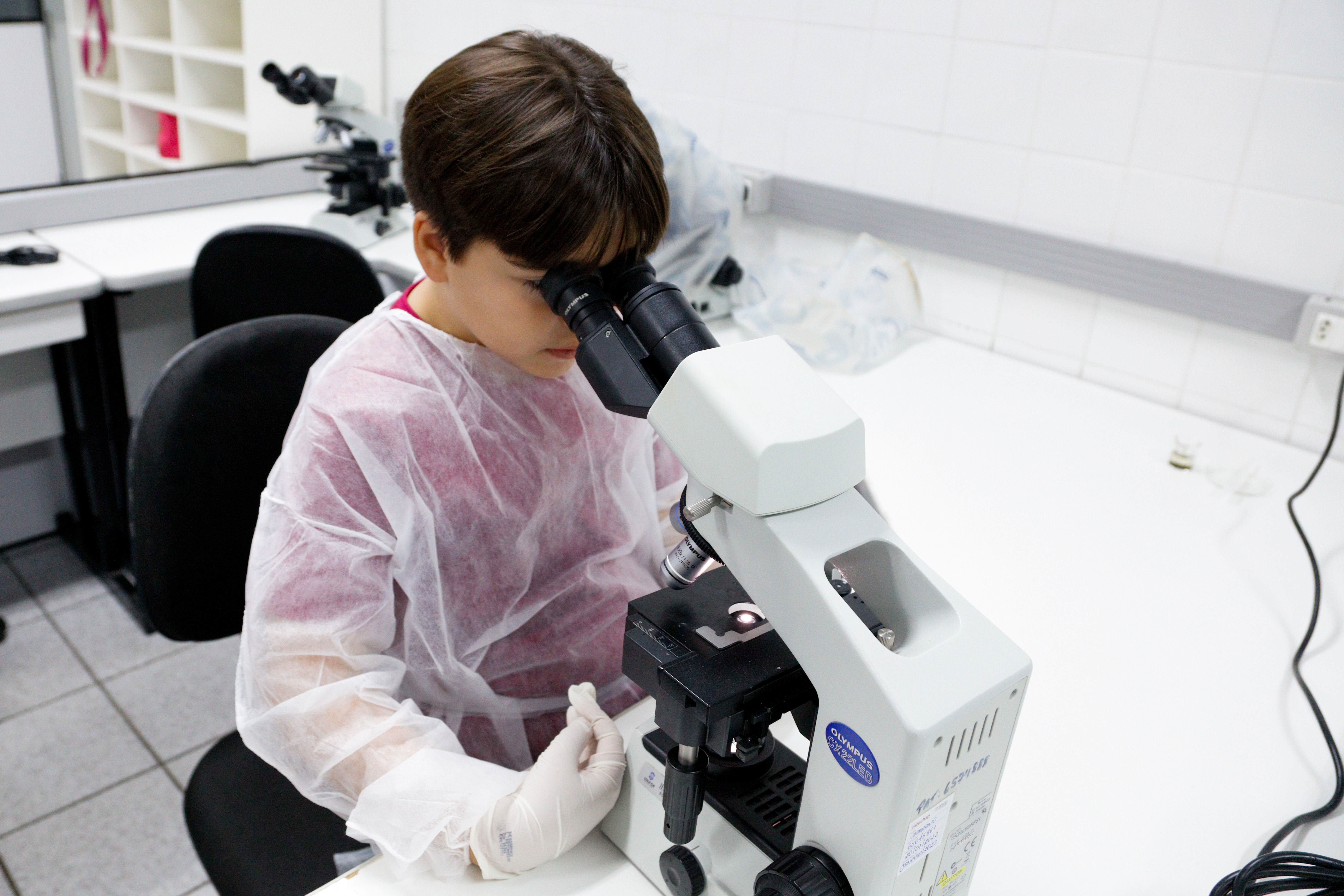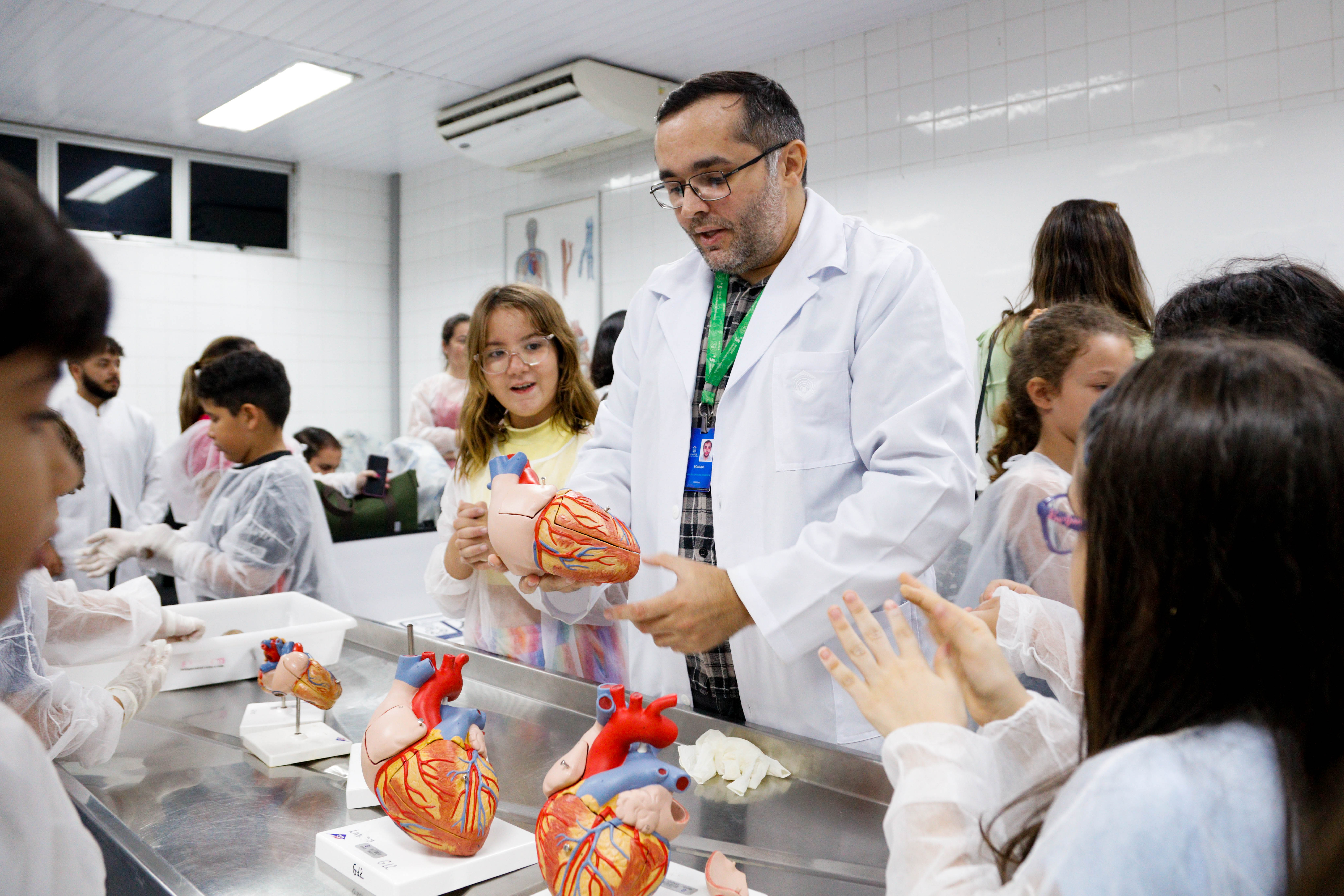 A tarde foi dividida em dois momentos: um ligado à área de saúde e outro voltado para a tecnologia. No laboratório morfofuncional do Centro de Ciências da Saúde (CCS), as crianças foram recebidas pelo professor da Unifor, Rômulo Porto, que deu uma aula expositiva sobre anatomia humana, trazendo, inclusive, peças reais, para que todos pudessem ver de perto a estrutura de um cérebro e de um coração verdadeiros. Na sequência, orientados pelo professor Ygor Elloy, os pequenos fizeram um experimento lúdico, que culminou na observação de organismos vivos ao microscópio.