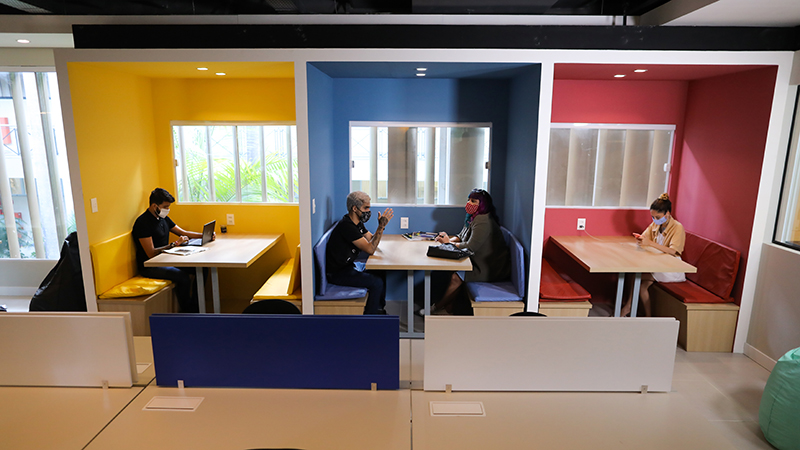 Ricardo Colares, coordenador do EDETEC, explica que a transformação do espaço aconteceu em paralelo à modificação da proposta de trabalho da incubadora, agora mais colaborativa. “Implementamos uma mudança na forma de trabalhar os programas de incubação. Idealizamos um programa com maior possibilidade de acompanhamento da maturidade das empresas incubadas. Fizemos um investimento não só na estrutura física do espaço, mas também no pensamento dessa modalidade de incentivo ao empreendedorismo por meio da colaboração por diversas formas, incluindo o contato remoto”, explica.